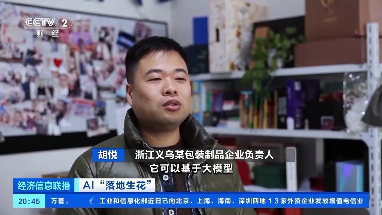 浙江义乌某包装制品企业负责人 胡悦:它可以基于大模型阅读、理解客户的信息,通过上下文获得客户的意图,然后回复客户,并且回复客户的话很自然。(央视网)